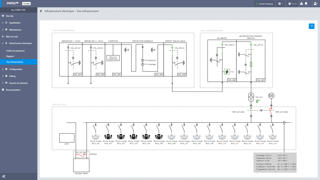 View of the status of each power supply station and charger (failure, overheating, etc.) and the status of the batteries (SOC).